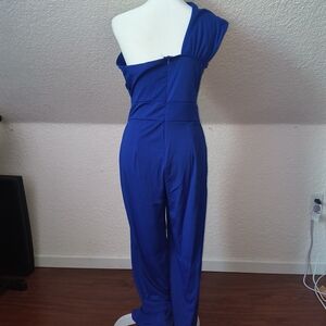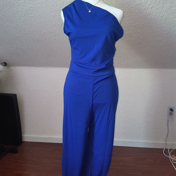 Blue one-shoulder jumpsuit. I originally bought to use as a pageant interview outfit but it was too long because I'm about 5 foot and didn't have time to get it tailored. This is brand new and has never been used.