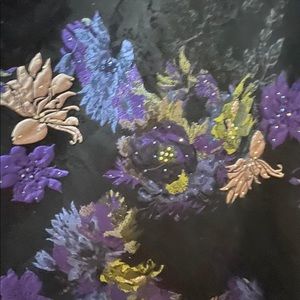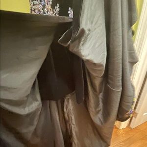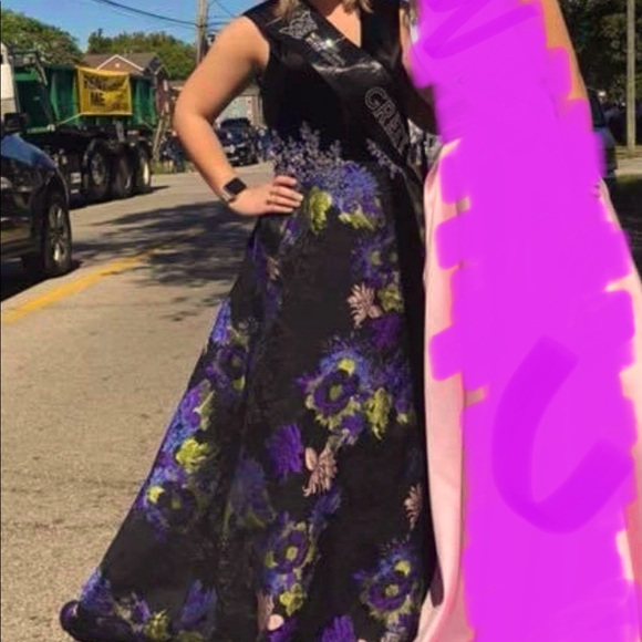 This gorgeous dress has a velvet bodice and beading around the waist line. The dress features pockets and has a slit going all the way up to the waist line. The dress also has a velvet under skirt to make it a High low dress. The dress is about a size 4 to 6 and has never been altered in length.