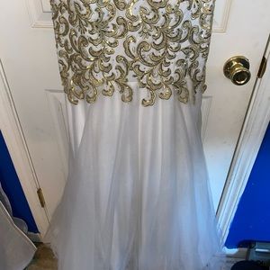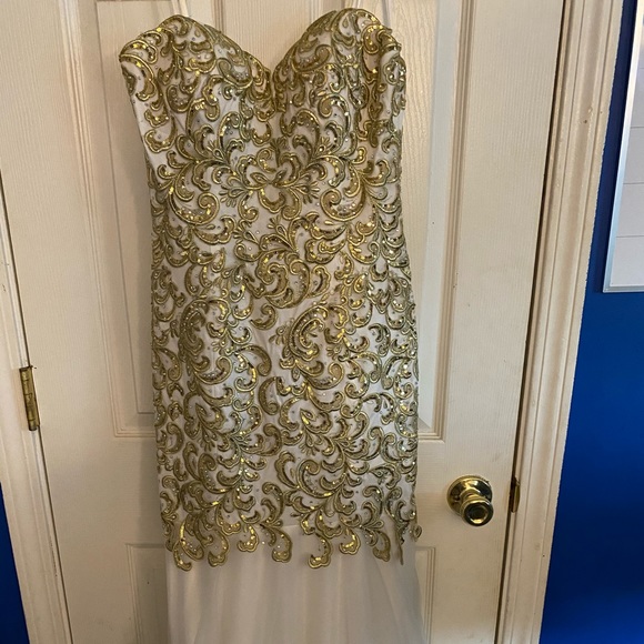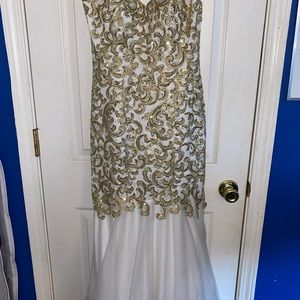 In love with this white and gold detail sweetheart neck line dress! Mermaid style. Show off curves! Won pageant with this! Size 6 worn once! In great condition! Tulle flare bottom! Don’t miss this one!
