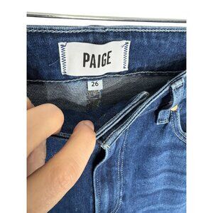 Excellent condition, no flaws, size 26. Paige Anessa Wide Leg Jean. High-waisted wide leg with a slightly relaxed fit and an ankle-length. Dark wash with natural fading. 93% Cotton/5% Polyester/2% Spandex