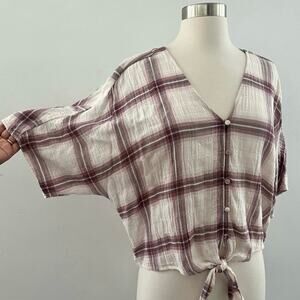 Paige Baylee Plaid Tie Front Cropped Top Women's S Dolman Sleeve Cotton Blend