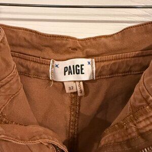 The Paige Burt Orange Shorts in size 32 are a stylish and versatile addition to any woman's wardrobe. Featuring a solid orange color with a relaxed boyfriend fit, these shorts have a drawstring and button zip closure for added convenience. Made with elastane and lyocell, these denim shorts are perfect for travel, casual outings, walking, beach trips, and more. The high-rise waist and pleated front give these shorts a classic American look that combines comfort and style effortlessly.