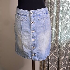 Stylish denim skirt with a classic button-front design. *NOTE- only the top 3 buttons open, bott 3 are decorative. Skirt is in excellent condition. Waist measures 28” & skirt is 17.5” long.