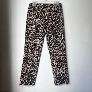Paige Denim Hoxton Straight Ankle Jeans in Sahara Leopard 27". Stretch denim leopard print. Raw cuffs. Straight-cut style. Ankle length. Hidden zip at fly. Button at waist. Slant hip pockets. Patch back pockets. 9.5" rise, 26" inseam, 11.75" leg opening. Shell: 98% cotton, 2% elastane. waist is 14.5" across, rise 10", inseam 27"