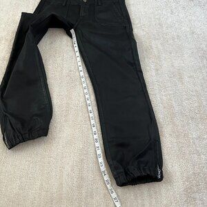 Black jogger jeans with faux leather coating. Fabric has stretch