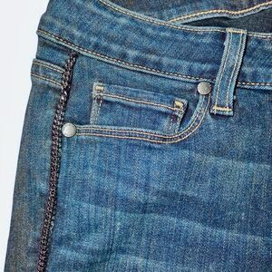 These mid rise ultra skinny ankle length jeans have a traditional five pocket design and black chain sewn into the side seam that runs down the leg. They are made of a stretchy denim for all day comfort. In excellent used condition.