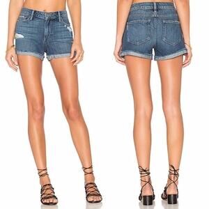 Paige Distressed Jimmy Jimmy Shorts in Blue Medium Wash. These mid-rise shorts feature a trendy distressed design and cuffed hems.
