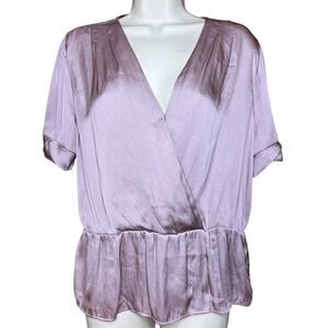 A satiny finish and peplum bring breezy charm to this flowy top that's finished with pleated details and a surplice V-neckline.