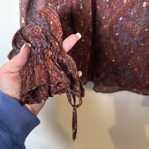 Metallic goldtone graphics fleck the print of this billowy long-sleeve top accented by romantic ruffles on the tied cuffs.