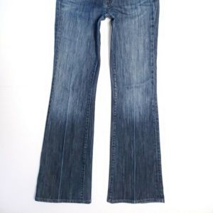 High-end designer jeans by Paige. High rise boot cut, "Hidden Hills", featuring embellished front and rear pocket designs, whisker accents, and vertical line details. Faded dark blue stone wash.