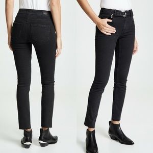 This pair is crafted with raw hems and more room through the calves than typical skinnies.