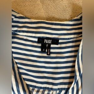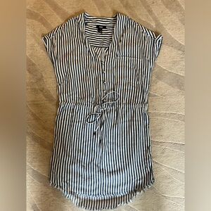Stylish striped button-down dress with a tie waist. Features navy and white stripes for a classic look. Perfect for a swim cover up or a dress for a summer day.