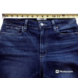 Paige Hoxton Ankle Skinny Jeans in Adalyn sz 28. Button and zip enclosure, 5 pocket. Cotton, polyester and spandex blend for stretchy comfort. Good used condition, don't see any holes or stains. Little puckering by the zipper. Measurements in pics