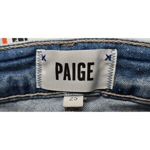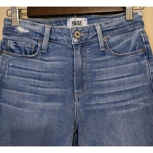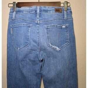 These Paige Hoxton Crop Mid Rise Ultra Skinny Jeans are a stylish and flattering choice with a cropped length and raw, distressed hem. They are in good pre-owned condition with no visible flaws.