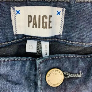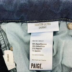 Excellent condition, no holes stains or heavy wear. Paige signature high-rise ultra skinny, the Hoxton is fitted from the hip through the leg opening. Cut from our TRANSCEND VINTAGE denim, this medium dark wash pair has the look of authentic vintage denim but is incredibly comfortable with plenty of stretch and recovery.
