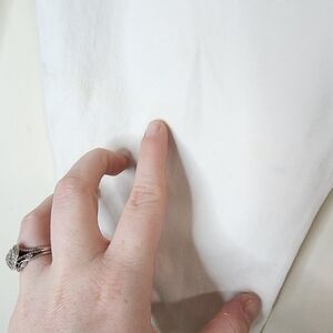 has a run along the back of both pant legs and a run on the front of one pant leg.