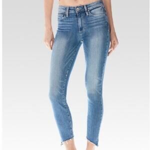 Stylish Paige "Hoxton crop" jeans! Mid rise in a medium blue wash with an asymmetrical, raw hem. Gently worn, just has a faint stain on back pocket. Size 26.