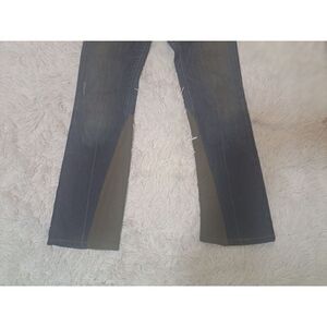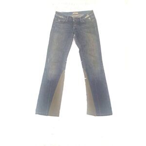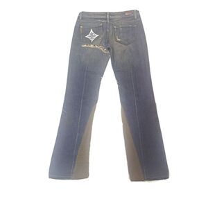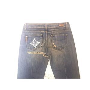 Boho Chic Paige Premium Jeans Style Name Laurel Canyon Boot Cut Destruction Jeans with Army Green Jersey Inserts in the Boot Cute Hem Size 26