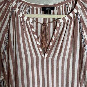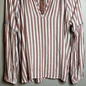 NWOT - New Condition Paige Jovannie Muted Clay Striped balloon sleeve Boho Blouse. Split neck with a tassel tie, balloon sleeves with embroidery trim and elastic opening, curved bottom hem.