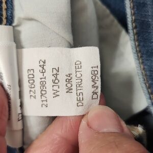 Great condition. Paige medium wash cropped and cuffed jean with “destructed” areas at knees and front pocket.