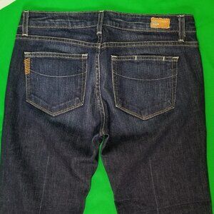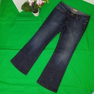 This high rise flare jean hugs the leg and widens mid-calf. Dark blue wash with subtle fading and whiskers. The perfect alternative to skinny denim.