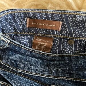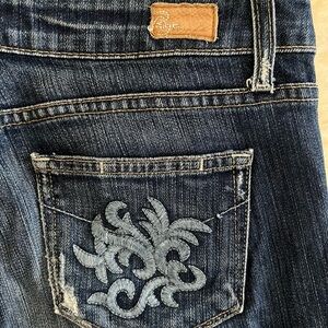 These very cute jeans are still new, barely worn. They’re stylish, yet comfy .. you could dress up or relax in these lol. They have beautiful embroidered back pockets, are mid-rise and fit true to size. Size 28