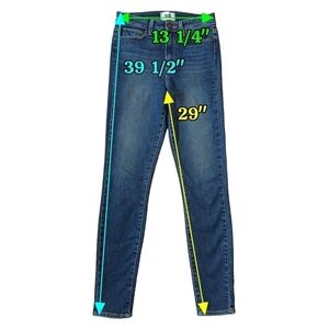Good used condition, with no stains or tears. Darker wash skinny jeans, with a mid-to-high rise. Stretchy. Has whiskering and intentional fading. Has the classic 5 pocket jean design, and a zip fly/button closure. The lighting is weird near the crotch in photo 3.