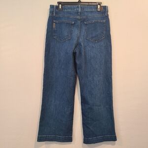 Paige Nellie Cropped Culotte Jeans in Linnea. The Nellie Culotte features a relaxed fit with a slightly flared leg in a classic indigo wash. Detailed with contrast stitching, whiskering and fading, these jeans are casual and comfortable, perfect for the summer season. They are in good preowned condition, there is a little fading.