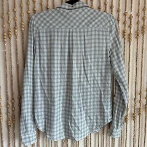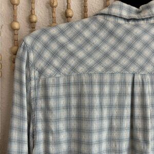 Paige Denim Nordstroms Light Blue White and Silver Tinsel Checkered Plaid Western Cottage Core Long Sleeve Pearl Button Down Cotton Blouse. Size small, has loose casual fit.