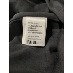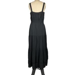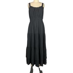 Paige 'Persimmon' Black Rayon Sleeveless Maxi Dress Size M: dress has shirring details, an elasticated waist, a slight sweetheart neckline, wide straps, and a double tier ruffle at the hem, measurements: 17 inch bust width x 14 inch waist width (unstretched) x 52 inch length.