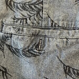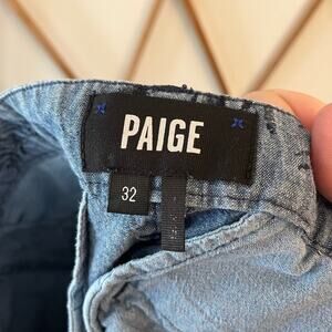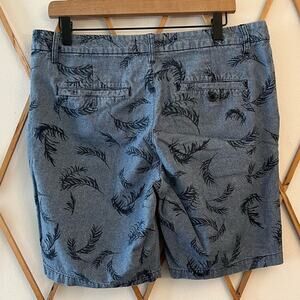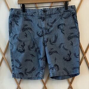 Paige chambray flat front shorts with blue leaf pattern. Overall good condition just missing button on one back pocket as shown in photos. Size 32