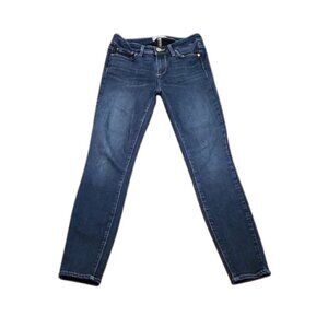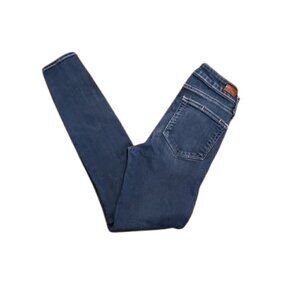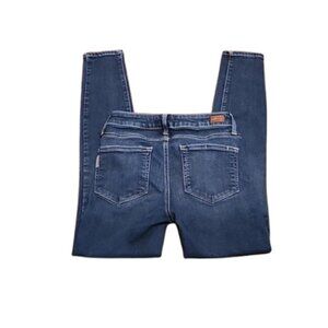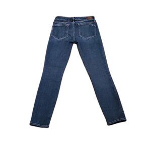 Medium dark rinse stonewashed ankle jeans. Mid-rise. Single button and zipper front closure. Whiskering accents. Sanded detail. Five pockets. Light puckering near the crotch (see pictures), but otherwise in Great Condition.