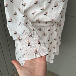 This is the PAIGE Serrano Dress in Off-White/Turmeric, size Small. Made of a lightweight cotton-viscose blend with 100% cotton lining, this feminine dress features a smocked elastic waistband, tiered skirt, ruffle cuffs, and a wrap-style bodice with subtle lace trim at the neckline. The dainty floral print in turmeric and soft brown adds a warm, romantic touch, perfect for spring, summer, or fall layering. Easy to dress up with heels or keep casual with boots and a denim jacket.