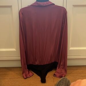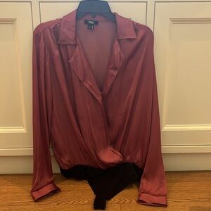 Paige Sevynne Surplice V Neck Shirt Bodysuit Silky Satin Long Sleeves Top