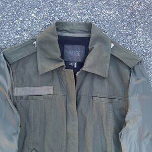 Features nylon sleeves and a cotton body. Cropped fit w/ belt