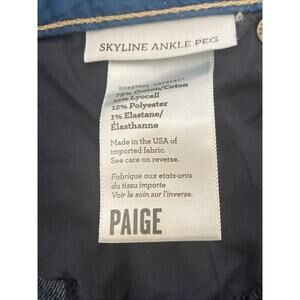 The Paige Skyline Ankle Peg Jeans in Women's Size 27 feature a dark wash denim fabric with a low-rise and ankle length, perfect for a stylish and versatile look. Made from a comfortable cotton blend material, these jeans have a solid pattern with a zip and button closure. The regular fit and classic blue color make them a timeless wardrobe staple suitable for all seasons. With the renowned quality of the Paige brand, these jeans are a fashionable choice for women looking for a trendy and flattering denim option.