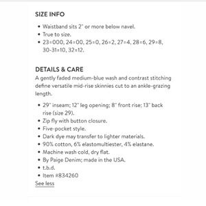 Paige Skyline Ankle Peg Skinny Slim Medium faded Ella Wash Jeans Pants $215 28/6