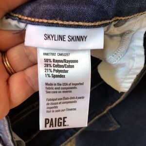Paige Skyline Skinny Jeans in a Dark Wash(Hugo). Rayon/cotton/polyester/spandex. 5 pocket style. Excellent condition(just a little stretching/pulling on 1 side—see last 3 photos). Size 28