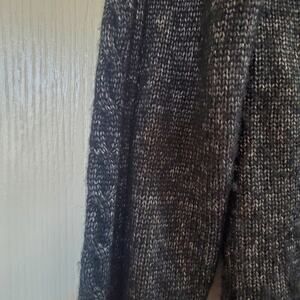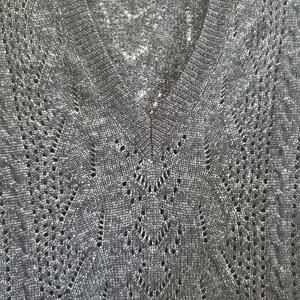 Style: Open-knit classic pullover v-neck sweater. Woven with small holed pattern throughout. Long, fitted sleeves. 60% Nylon, 40% Wool. Black and shiny silver thread. Moderate stretch. Hand Wash Only. Made in China.