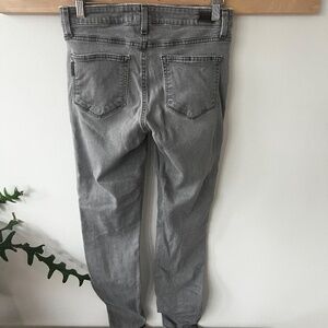 Our popular, ultra skinny, mid rise ankle jeans are made from a comfort stretch fabric with a super soft hand feel. In an alluring light-to-mid range indigo wash with whiskering, abrasion, hand sanding through the thigh and destructed hems. Preloved, shows some signs of wear, but has a lot of life left. 93% cotton, 5% polyester, 2% spandex Made in Mexico Machine wash Zip fly with button closure 5-pocket design Stretch fit