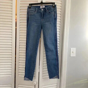 These Paige Verdugo Ankle Skinny Jeans in size 25 are in good condition and offer a stylish addition to your wardrobe. The jeans feature a classic skinny fit that flatters the figure, with a cut-look ankle design for added flair. The navy side fabric hem detailing adds a unique touch to the jeans, elevating them from basic denim to a fashion-forward piece. Perfect for casual or dressed-up looks, these jeans are versatile and on-trend. Pair them with a blouse and heels for a night out or with a t-shirt and sneakers for a more relaxed vibe.