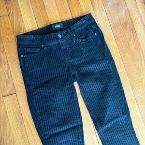 Super cute velvet black pinstripe ultra skinny jeans. In excellent condition, no known flaws. Coloring hard to capture, definitely true black in person!