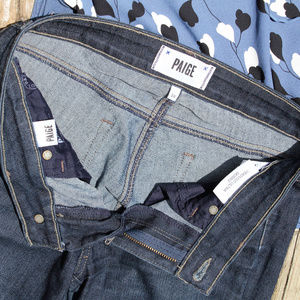 Very good condition. Paige size 26 skinny jeans in a dark blue wash from the Verdugo Ultra Skinny line, mid rise. From Nordstrom. See tape pics for approximate measurements.