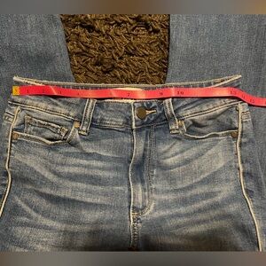 No holes. Distressing is present on the top of the jeans around the belt loops (natural/how it was made)