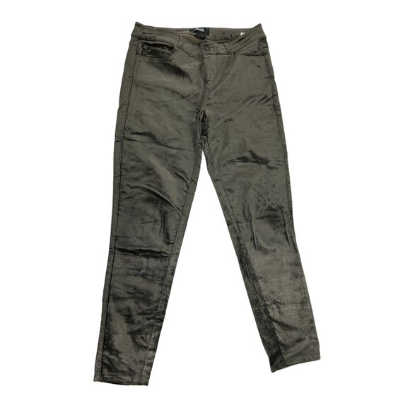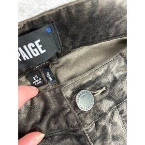 These metallic-coated skinny jeans in a sleek olive green hue are crafted by Paige. They offer a contemporary and luxurious aesthetic, adding a touch of shimmer to your wardrobe. Perfectly tailored for a size 26, they provide both style and comfort with their premium material and modern design.
