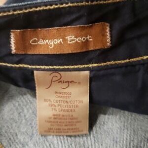 From Paige denim, women's size 31 canyon boot style, great condition! Dark faded wash, classic 5 pocket style, belt loops, button waist/zip fly, boot cut legs, lightweight denim. Very light wear in between the thighs. 80% Cotton, 19% Polyester, 1% Spandex. MADE IN USA.