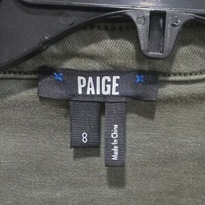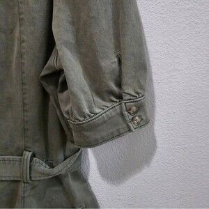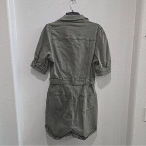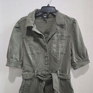 Paige denim olive romper with tie sash and button front, tailored button sleeves, front, chest and back pockets size 8.