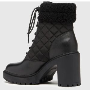 This dressed up hiking boot design features a full one-piece rubber unit bottom with lug tread and diamond textured welt. This pair features nylon padded quilted side paneling, genuine shearling collar, and black and white sporty round cotton laces. The rubber outsole and block heel allows for easy walkability and the signature cushioned insole guarantees a comfortable fit from morning to moonlight.