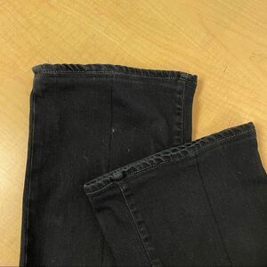 Super flattering Paige bootcut. They are distressed jeans; see pics. Some pics look blue or gray…washed out…these are black distressed jeans. They have been hemmed professionally. See pics. Length is 31 inseam.