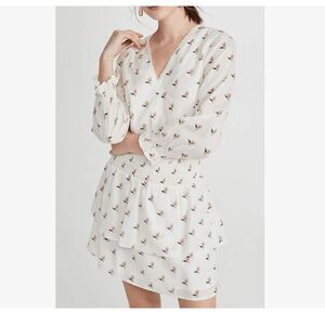 This is the PAIGE Serrano Dress in Off-White/Turmeric, size Small. Made of a lightweight cotton-viscose blend with 100% cotton lining, this feminine dress features a smocked elastic waistband, tiered skirt, ruffle cuffs, and a wrap-style bodice with subtle lace trim at the neckline. The dainty floral print in turmeric and soft brown adds a warm, romantic touch, perfect for spring, summer, or fall layering. Easy to dress up with heels or keep casual with boots and a denim jacket.